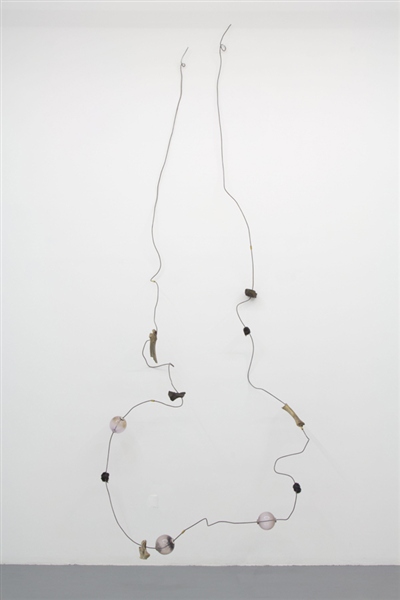 Joe Brittain, Timeline, 2011, steel, fossilized bone, coal, glass, black sand and magnets, 144 x 60 x 30 inches