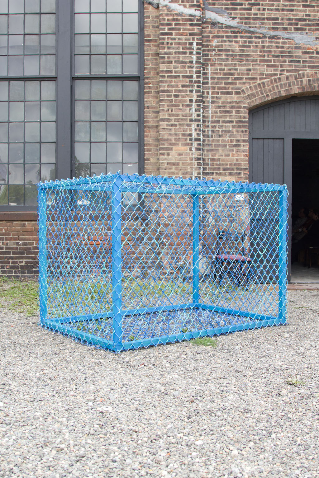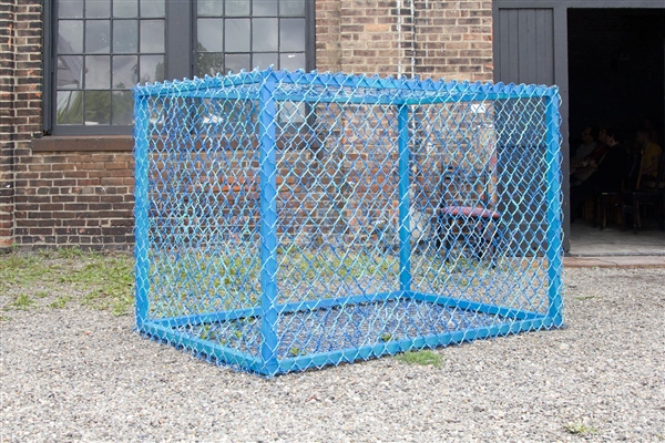 Lizzie Wright, Big Blue, 2012, wood, chain link fence, dirt, sand and acrylic paint, 4’ x 6’ x 4’