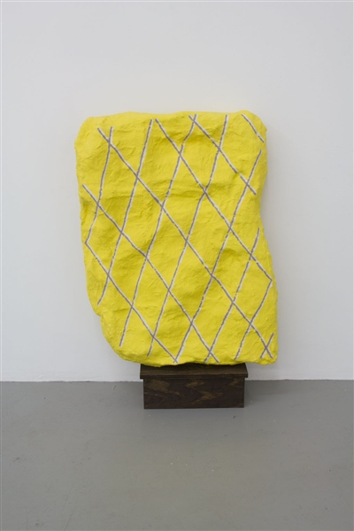 Stacy Fisher, Yellow and Grey Sculpture on Wood, 2011, Hydrocal, burlap, wire mesh, latex paint and wood, 42 x 27 x 8 inches