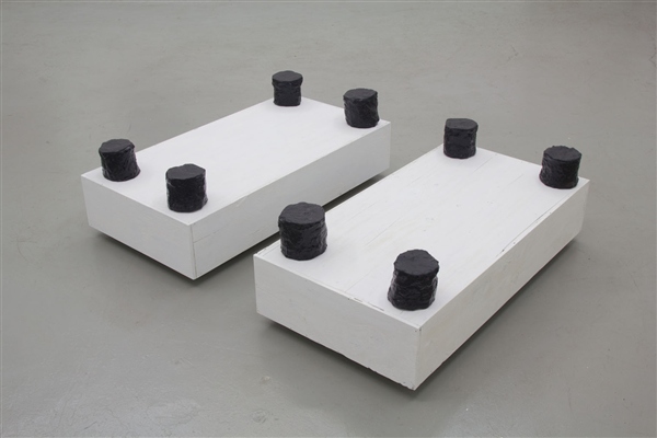 Stacy Fisher, Black and White Objects, 2012, Hydrocal, enamel paint, wood, primer, 14.5 x 43 x 63 inches