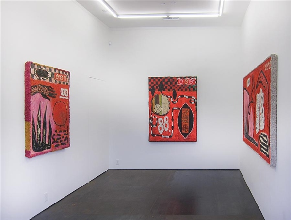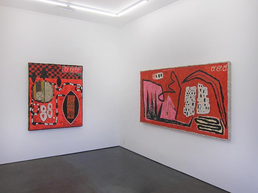 Regina Rex is very pleased to present a solo show of new work by Brooklyn artist Britta Deardorff at Bunker259. Drawing on intuition, symbolism, and innate graphic powers, Deardorff creates charged images in which archetypal iconography, text, and checkerboard patterns overlay and cultivate an aggressive physicality. Deardorff incorporates sawdust, clay, and sand into her paint to create an earthen rocky texture, an effect of naturalism which is then contradicted by a surface coating of saturated reds, fluorescent oranges, discordant fertile greens, whites and blacks. In combination with the recurrence of snakes, silhouetted hands, and spiky tendrils the sum effect is one of animus and an anxious mysticism.