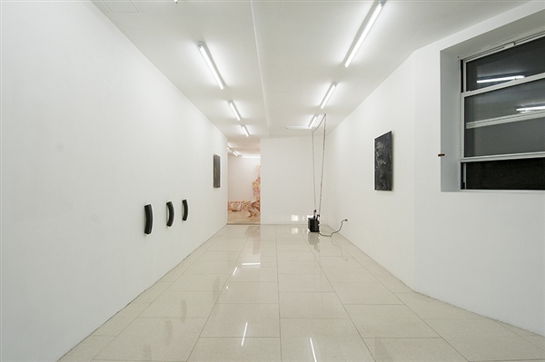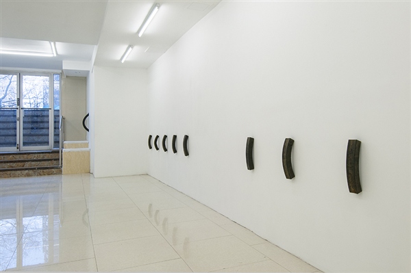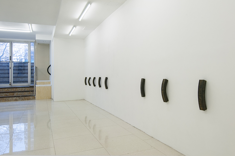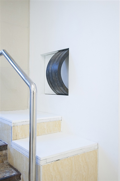 Matthew Schrader looks at the often imperceptible materials that drive the transportation of ideas, goods and bodies around the world. From his use of rare earth magnets culled from the inside of discarded hard drives to, in this case, spans of dense rubber used as gaskets to seal the windows on large cruise liners and cargo ships, Schrader isolates processed materials away from their specific functions so that their potent physical qualities overwhelm. Considering the properties of each component, Schrader builds flexible forms that examine forces both social and mechanical.