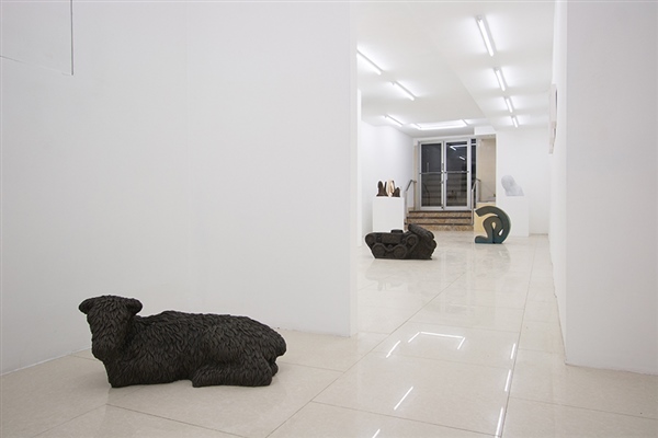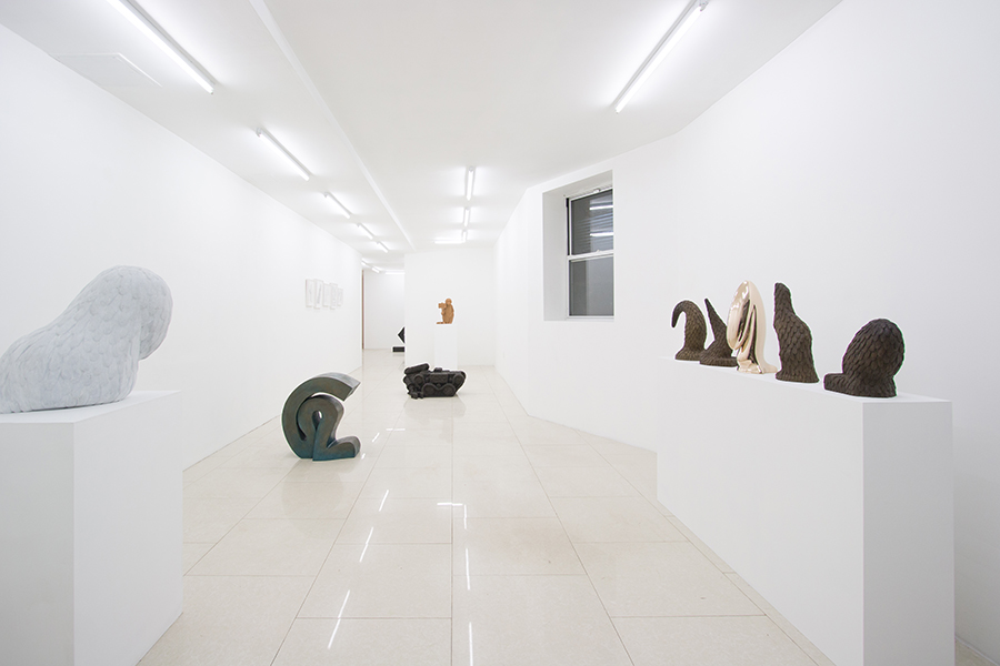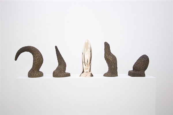 There is a photograph by Edward Steichen in the collection of The Met that captures a day in 1920 in his garden in Voulangis, France. A group of workmen, supervised by Constantin Brancusi are erecting a twenty-four foot high version of the artist's Endless Column. The column is nearly horizontal, looking less like the modernist totem it became and more like what it was: an undulating form carved from a tree in the garden itself. The day was just two years after Brancusi made his first column, comprised of a pair of truncated pyramids fixed together at their bases. The repetition of this combination produces an infinitely expansive event that appears simultaneously still and rhythmically in motion. In Steichen's garden that day, Brancusi, looking more prophet than craftsman, completed his own infinite loop, from nature to sculpture to nature again. In all of his sculptures, Carl D'Alvia is Steichen, Brancusi, and the workmen: he is making a new nature out of extant material, reshaping an object or material into something unexpected, creating a simulacrum of that thing, and in doing so documenting its very existence. This is demonstrated across his two exhibitions at Nathalie Karg and Regina Rex; the former being a show of his most conceptually ambitious, and largest works to date, and the latter a much-needed, if informal, retrospective of the last decade of his work. The titular sculpture of these dual shows is Endless, which is staged across the floor of the Karg gallery: 8 rhomboids with two halves on either end. These rhomboids resemble anamorphic boxes (they are quite impossible to photograph) made of individual resin planks that each have quite distinctive grains. The grains are a form of three-dimensional drawing--a knowing deception that continues as the boards are assembled into a "box," right down to illusory slotted screws. The boxes lean at nearly impossible angles. One wants to sit under them for shielding, lie on top of them for some air, or just meditate on their movement. They form a contemporary Endless Column, but as though the workers of Steichen's photograph never lifted it off the ground--it repeats across the ground in Minimalist fashion. These boxes, like so many of D'Alvia's objects, are dense with allusion and meaning. They are physically empty inside, but packed with thought. Like Steichen's photograph, "Endless" is neither the thing itself nor an image of the thing, but something in between. It is an imaginary object, more akin to one of Borges' Imaginary Beings than to anything in our known world. Carl D'Alvia is something of a romantic, and one with a perverse sense of humor and love of art history and the paradoxes it offers to those with their eyes open. His other new works at Karg include a collapsing monolith made from aluminum, as though a John McCracken suddenly stood up, entered a Kubrick film, became alarmed at the site of the uncertain terrain, and simply collapsed in on itself. That's the funny angle. It is also a strikingly profound entry into that most fraught category of art: terror, for it seems to embody the World Trade Centers of our minds, and the weight of its final curve makes one fear for the ground underneath it. On a lighter note, but no less impossible is a mandala-like puzzle of 40 clumps of ceramic spaghetti, because what is better to worship (and in doing so, transform) than this most delicious of pastas. The spaghetti, like D'Alvia's woodgrains, are drawings as much as objects--with the obsessive, stroke-after-stroke, from-the-shoulder gesture that one might expect to see in a drawing by Rubens. This translates, of course, to paper, on which D'Alvia excels at delineating contours in space, creating Surrealist images that place his objects into a world consisting only line and tone, and thus deep, everlasting space. These drawings, and their corresponding objects, are on display at Regina Rex, where we can see the evolution of a way of thinking about sculpture. There is the fascination with surfaces--spaghetti, fur, feathers--and the leveling and transformation of totems old and new (mushrooms, a calf, an all-too-human monkey, Tony Smith, Cheech Wizard, bongs, and monster cars) into D'Alvia's unique Minimalist-inflected Baroque-Surrealist language. This list of objects and references should indicate the wide ranging and highly democratic territory D'Alvia covers. These works also ask questions and make statement of and about sculpture. They show that minimalism, like, the artist notes, country music, is a language open to multiple uses, including figuration and humor, and needn't necessarily stand in opposition to the baroque. A Tony Smith-inflected dog can be all precise angles and yet covered in a downy resin fur. It is not a dog, nor a sculpture of a dog, but some better simulation of what a dog sculpture might be. It is hard and soft, spooky and funny, and utterly sui generis. A series of five recent bronze "birds" (returning once again to Brancusi) each depend for their fluctuating identities on an interplay between their seemingly oppositional forms and surfaces. The forms each hint at a referent, and the surfaces sometimes subvert and sometimes confirm it. Moreover, these sculptures, when placed in the world, are like all of D'Alvia's work, somehow informal. They are not on elaborate wooden bases, but on a table. They invite petting, and questioning. They are good companions. D'Alvia layers meanings and then suspends any conclusion about them. These objects, which have so much personality, are built as much from historical material and philosophical questions as they are from the traditional sculptor's toolkit. So, what we have here is a complicated but very human kind of activity, one very much about appreciating life's supposed contradictions and, rather than trying to resolve or ignore them, celebrating them in material form. And, so as not to end on too inappropriately serious a note, one should remember that spaghetti is e