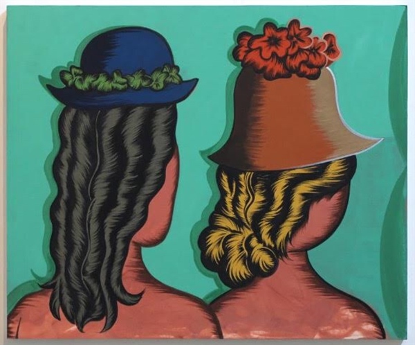 Two women, two hats, 2014 Flash paint on paper and wood panel 20 x 25 inches